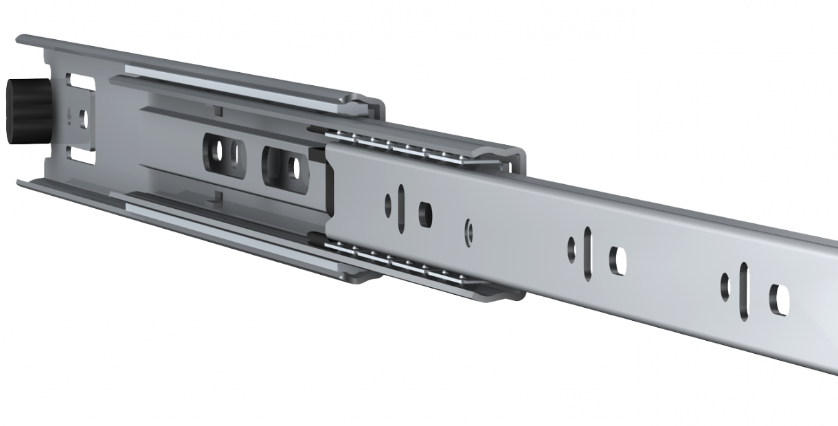 Volledig uittrekbare telescopische geleider met kogellagers, sluitrubber en een Disconnect functie. Deze geleider ondersteunt lasten tot 25 kg/55,1 lbs en kan worden gebruikt in kleine opslagsystemen en andere meubeltoepassingen.